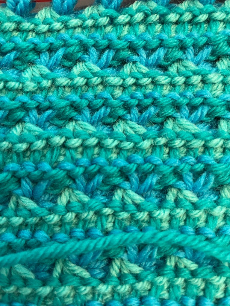 Next time I do this stitch, I will use yarn colors with more contrast. That said, you can see the blue loop on the right is where I was finishing the previous row. This row I am going to do the TSS3TOG. Insert the yarn through three stitches (the sort of greenish loops in the photo). Yarn over and pull through all three. Then yarn over again, insert into the same stitches, yarn over and pull through just those original three. You should now have three new loops on your hook.