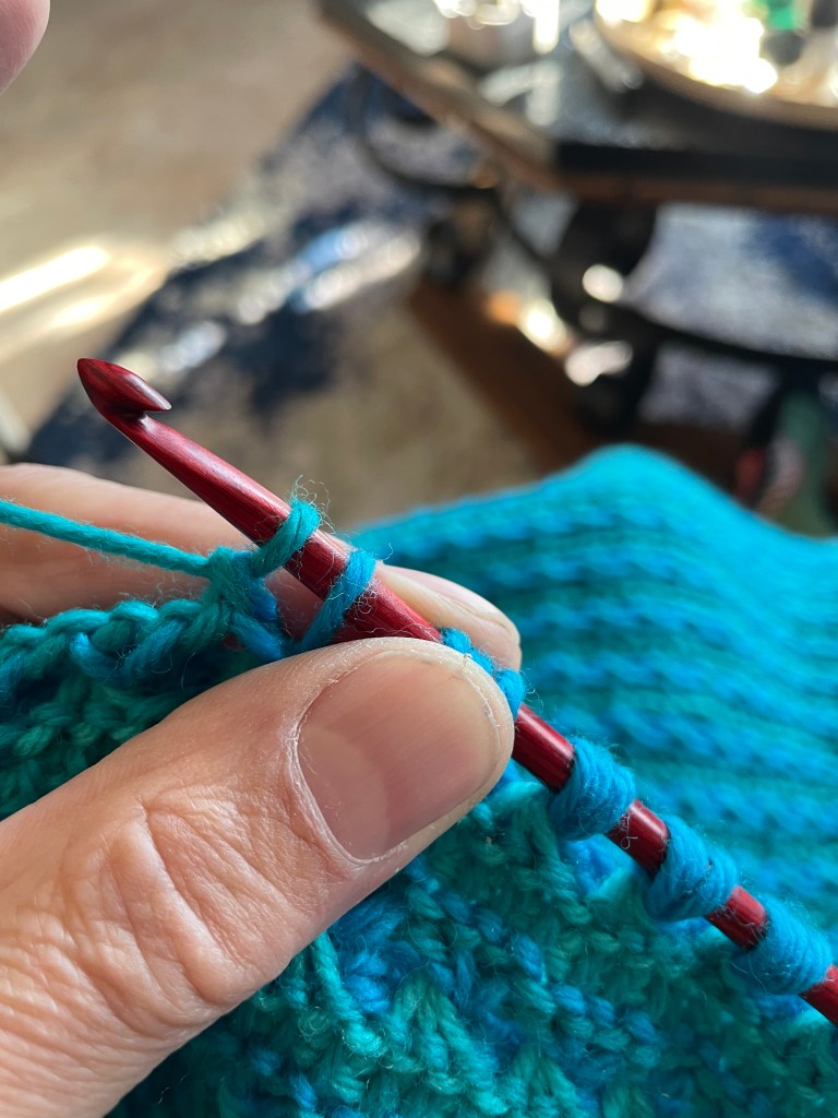 Look closely here just below my thumb. You can see those three green threads coming from the same area fanning out. Looking across the whole piece, that bottom row is easier to see. Now focus up on what’s between my thumb and the end of the hook. Those are the three stitches where I want to put my three purl stitches. That middle one really likes to hide, so if you’re going to try this stitch start with high contrasting colors (can’t really go wrong with black and white). You don’t have to use different colors to do a Star Stitch (what it’s called not in three colors with intermittent purl stitches [I think]). But to start out do so, that will make seeing that stitch much easier, as it will be a different color from it’s background. Make sure to switch colors on the return pass. The other way, (forward pass) won’t give you the contrast that you want.