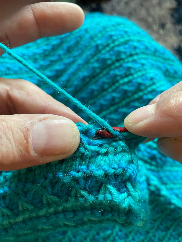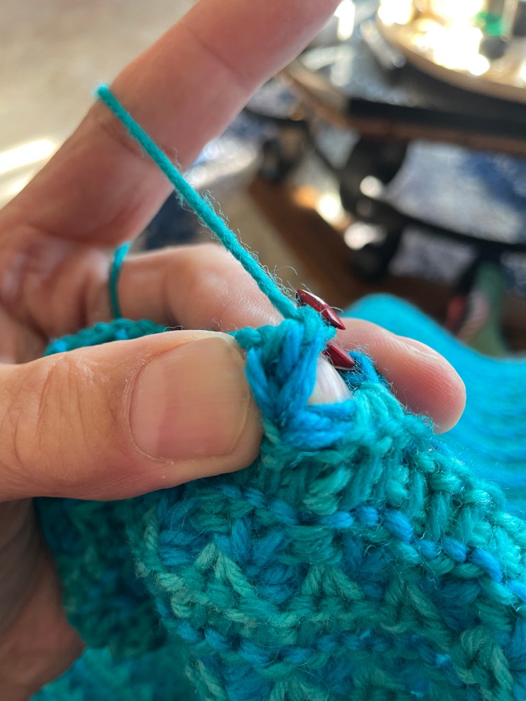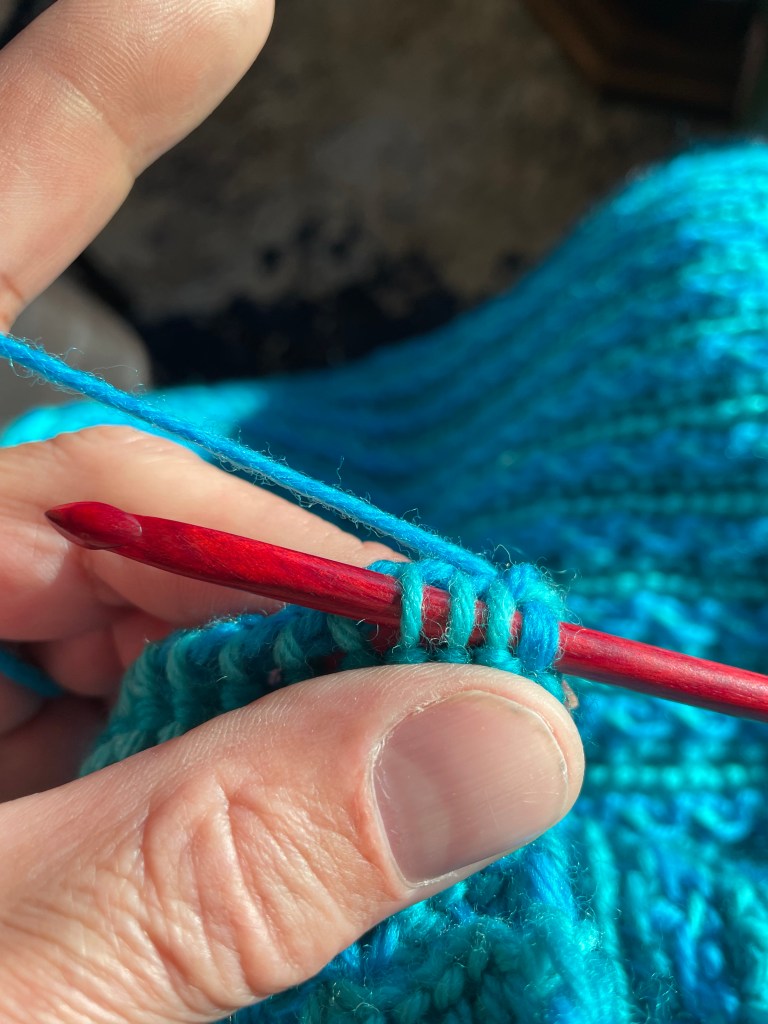 The trick with this stitch is the middle one, that bit of blue at the end of the hook is the stitch that I want to work my purl stitch into.
