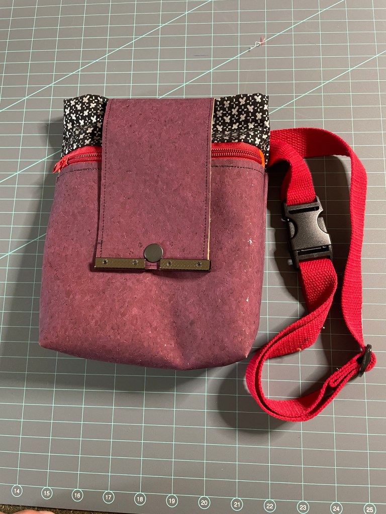 This versatile bag is made with quilting cotton and cork fabric. Cork fabric is a leather alternative, with the look and feel of fine leather. The bag can be worn over the shoulder, cross body, or around the waist. It features a large main interior with two additional pockets. There is a zippered pocket in front and yet another pocket on the back. The snap closure will keep your everyday carry items secure.